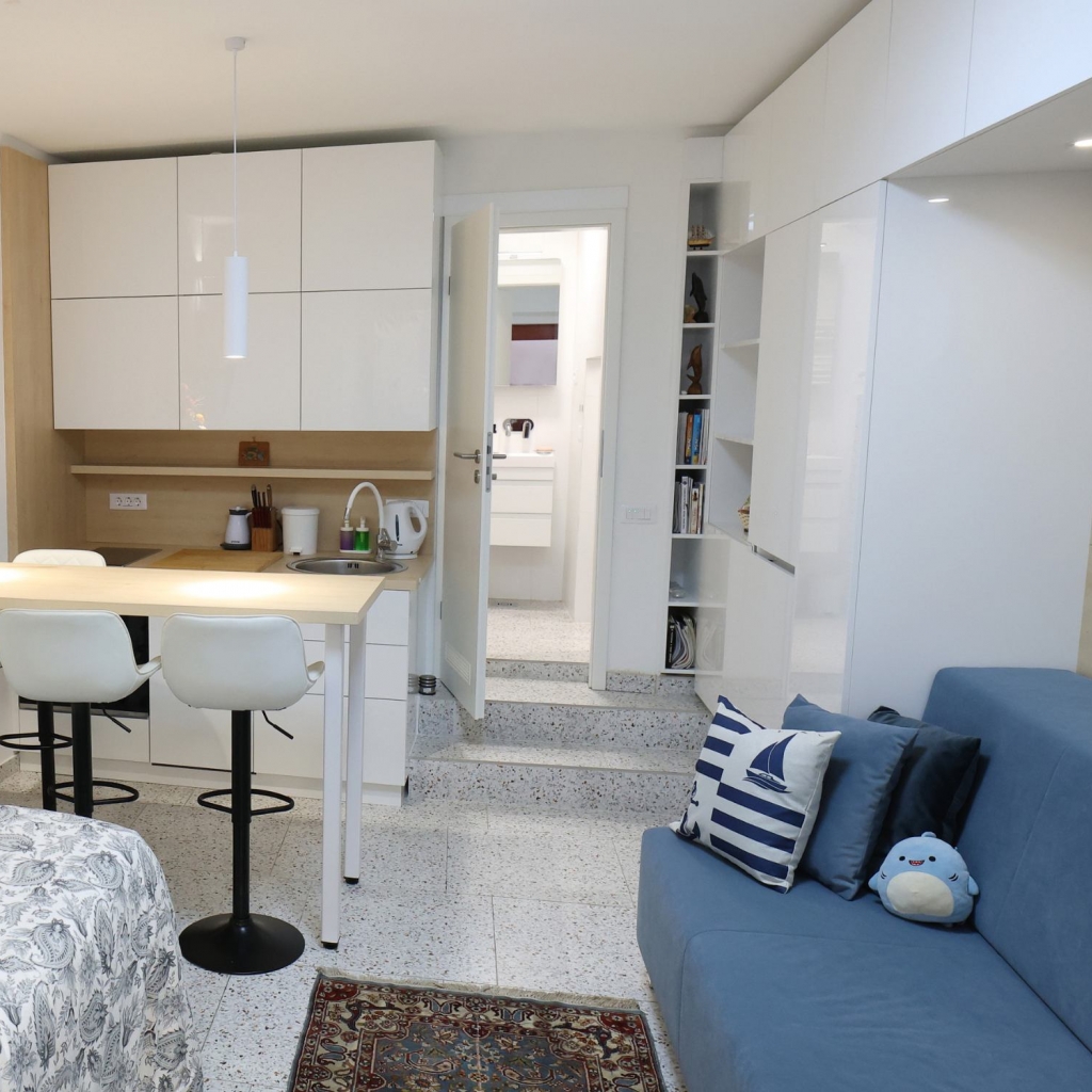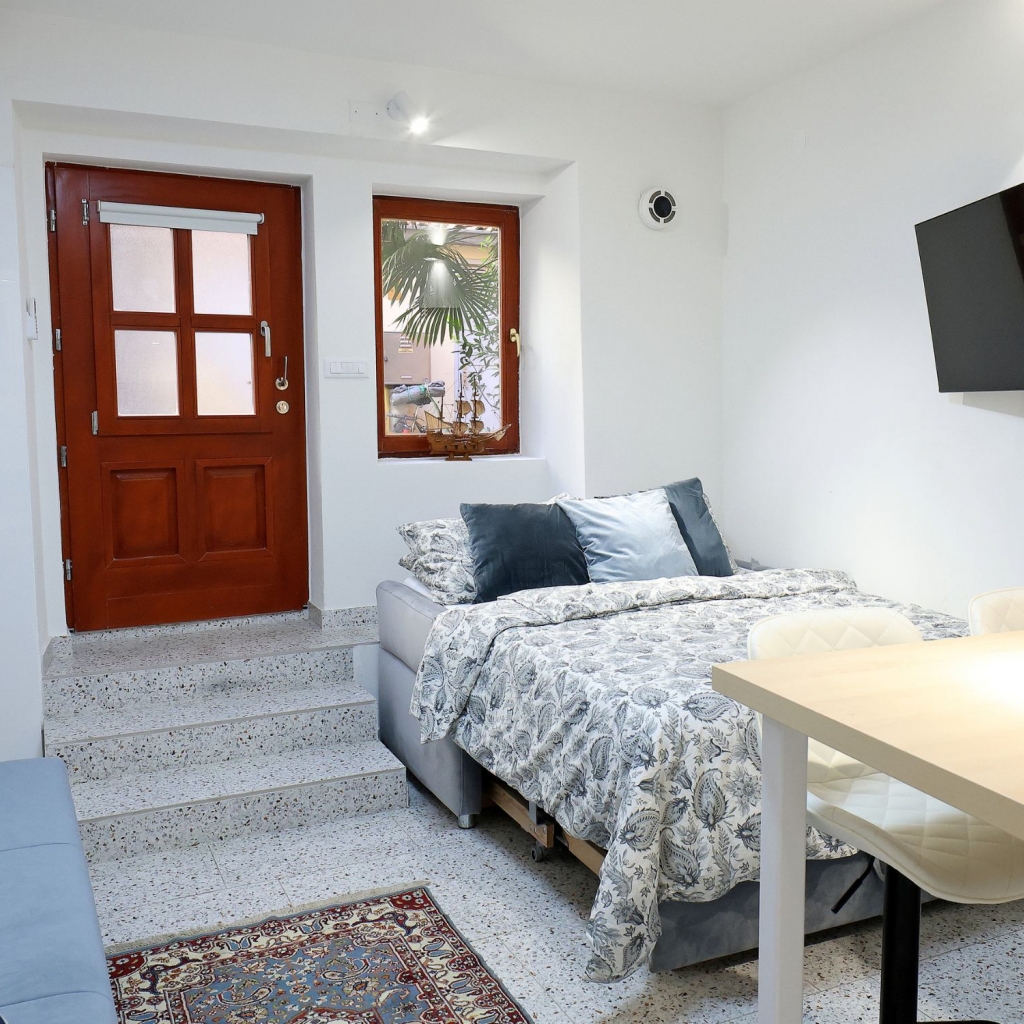 Studio se nahaja v pritličju večstanovanjske hiše in ponuja prijetno, funkcionalno zasnovano bivanje za sproščen oddih ob morju. Prostor je svetel in udoben, z zakonskim ležiščem za 2 osebi, dodatnim sedežnim kotičkom, prostorno omaro ter jedilno mizo, ki služi tudi kot kuhinjski pult.
