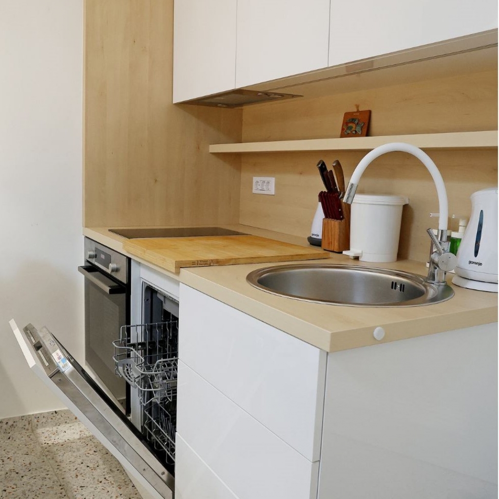 Kuhinja je del osrednjega prostora in je v celoti opremljena s kuhalno ploščo, napo, hladilnikom, pomivalnim strojem ter vso potrebno posodo in priborom.