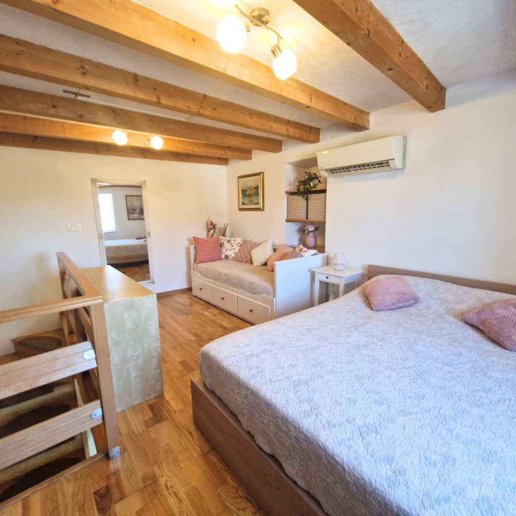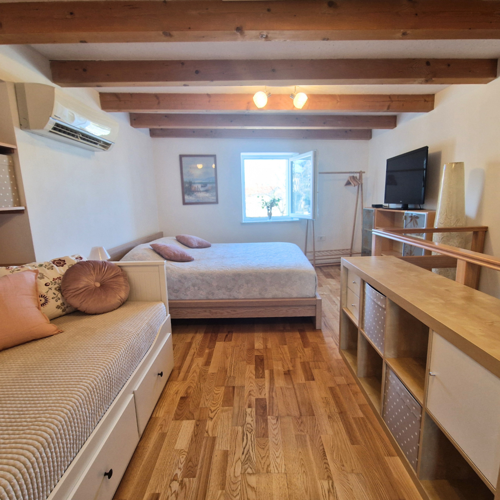 V prvem nadstropju je spalnica z zakonsko posteljo in raztegljivim dvojnim ležiščem. V pritličju se nahaja popolnoma opremljena kuhinja z jedilno mizo za štiri osebe ter kopalnica s prho. Obe etaži sta klimatizirani, na voljo pa je tudi hitri brezžični internet. Posteljnina in brisače so vključene v ceno najema. Parkirišče je na voljo čez cesto na javnih parkirnih mestih.